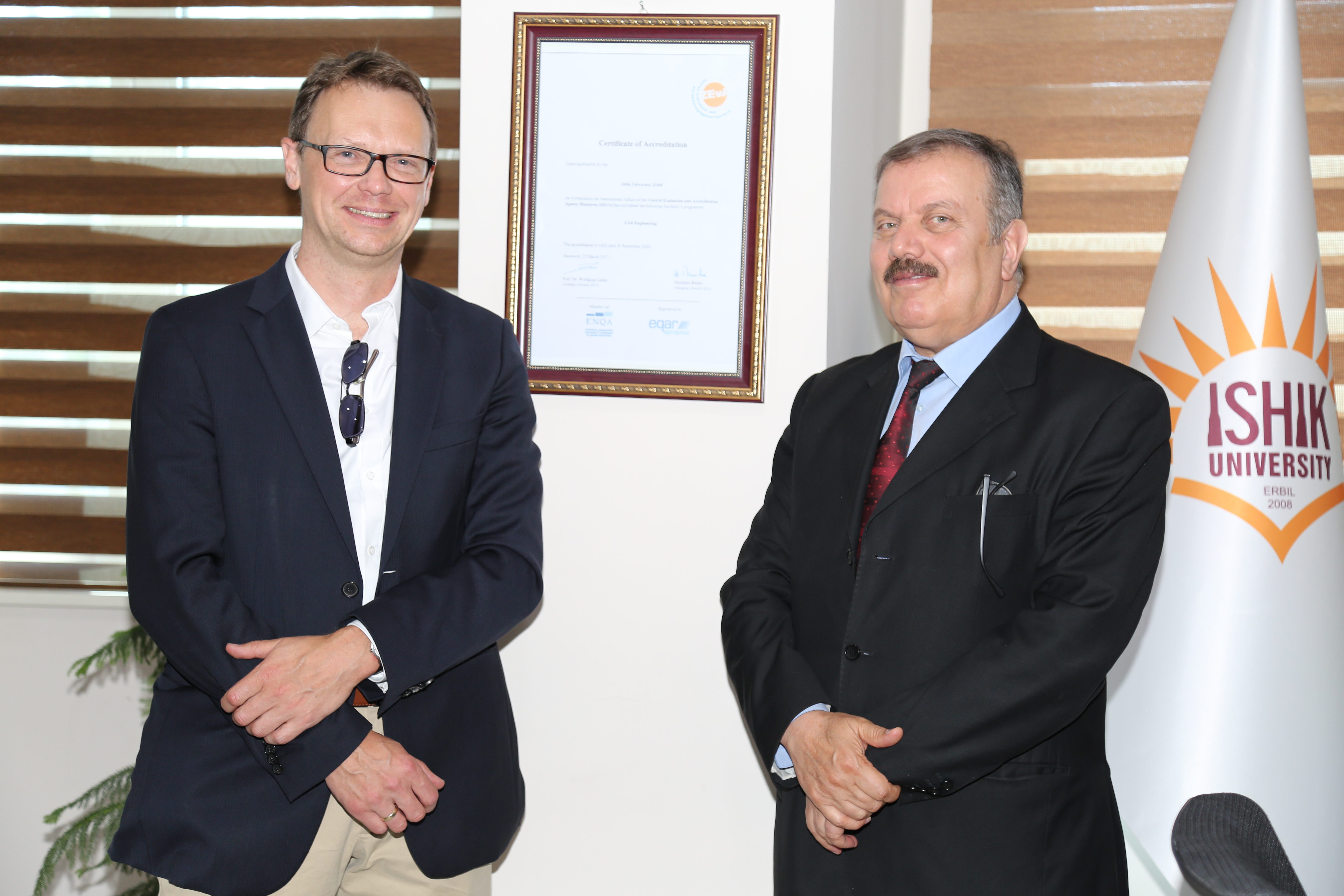 In this regard, on May 17, 2018, a delegation from ZEvA (A German Accreditation Agency) represented by Dr. Jurgen Petersen (the Head of Division for Institutional Accreditation) and Ms. Didar Al-Dawdi (the Project Officer for the International Affairs) visited Tishk International University and held a meeting with Dr. Idris Hadi Salih (the Head of the Board of Trustees), Dr. Mehmet Ozdemir (the Vice-President of Academic Affairs) and the Members of the Accreditation Committee of Tishk International University. The meeting started with a presentation about Tishk International University by Dr. Idris and continued with another presentation about ZEvA and the Accreditation Procedure by Dr. Petersen. Then some points related to the procedure and the self-report were discussed and well clarified. Also, the timeline of the procedure was determined.