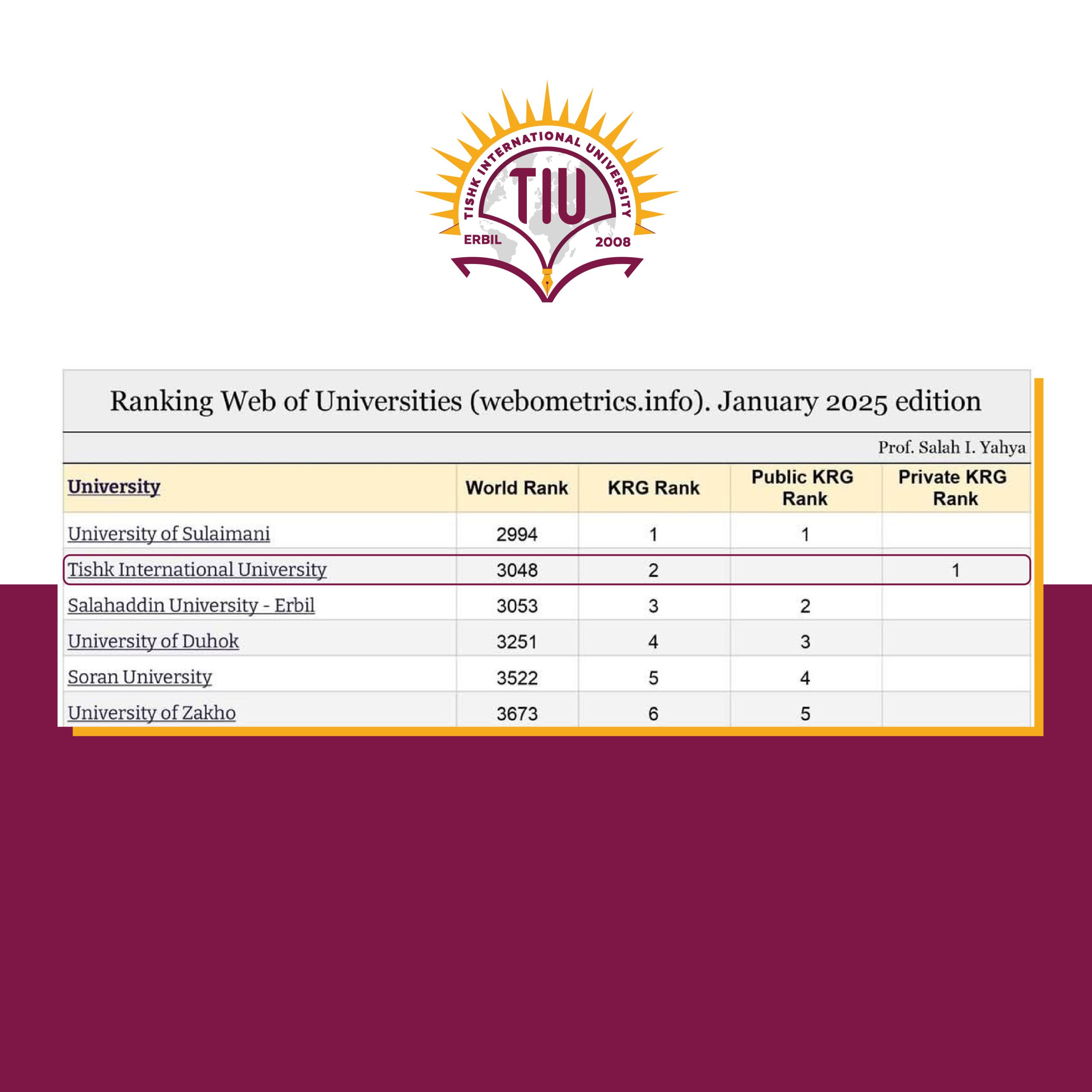 Tishk International University (TIU) has achieved a significant new milestone. It is now ranked as the number one private university in both the Kurdistan Region and Iraq. This is according to the latest Webometrics rankings.